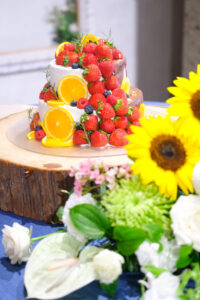 青いクロスに映える向日葵がとってもきれいな会場装花🌻