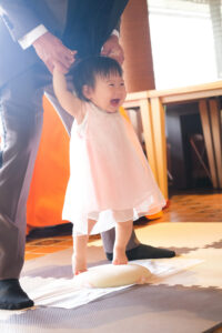 新郎様に支えられながら小さい足で一生懸命餅を踏む姿が