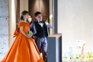 オレンジ色のカクテルドレスにお着替えした新婦様!