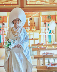 伝統ある独立型神殿で、厳かに。そして、家族に見守られながら一歩ずつ歩む参進の儀。 鹿児島市南栄のサウスヴィラガーデンでは、おふたりとご家族の心が通い合う和婚をご提案しています。